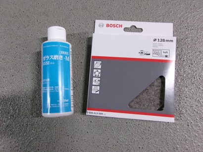 3Mのガラス用コンパウンドと、フエルトのポリッシャーパッドです。